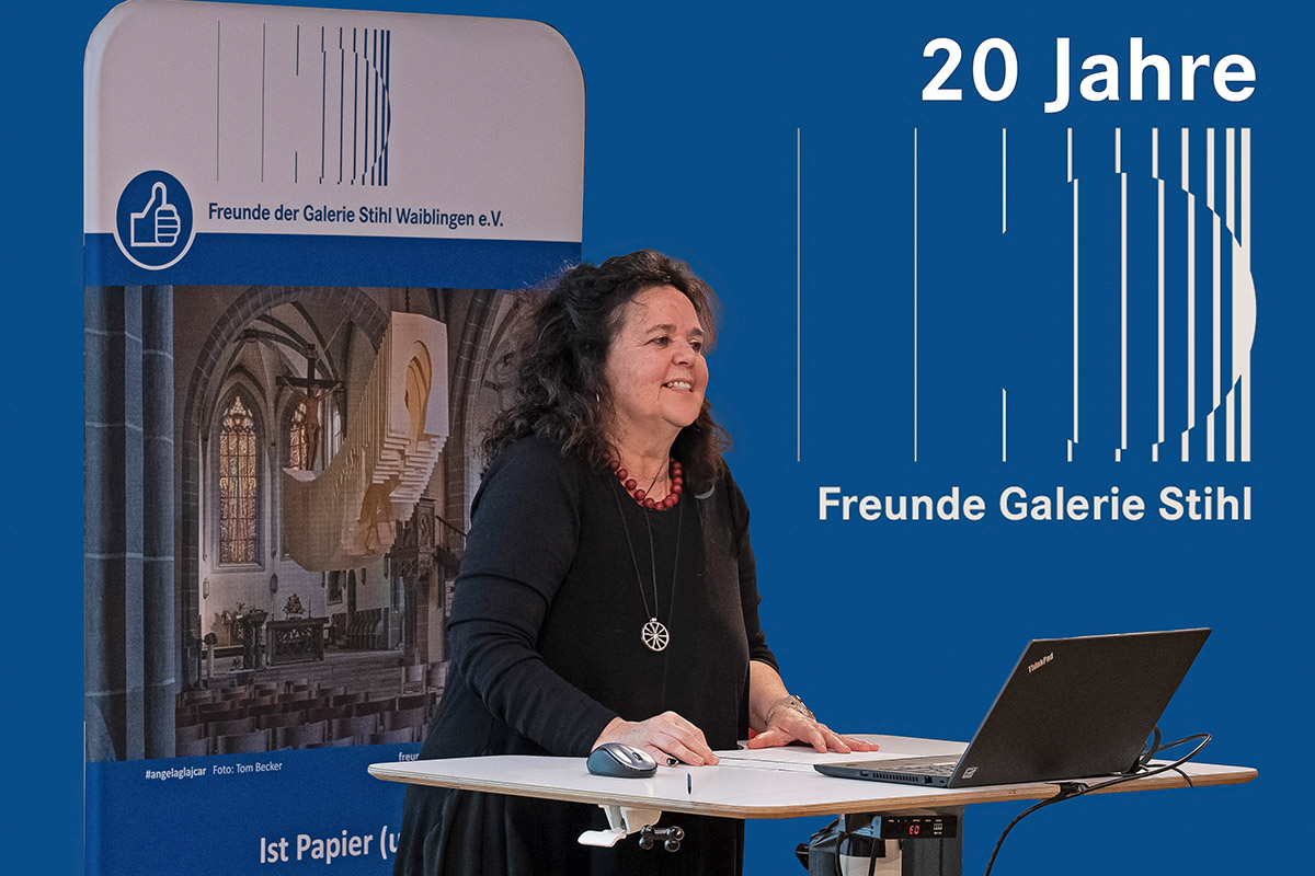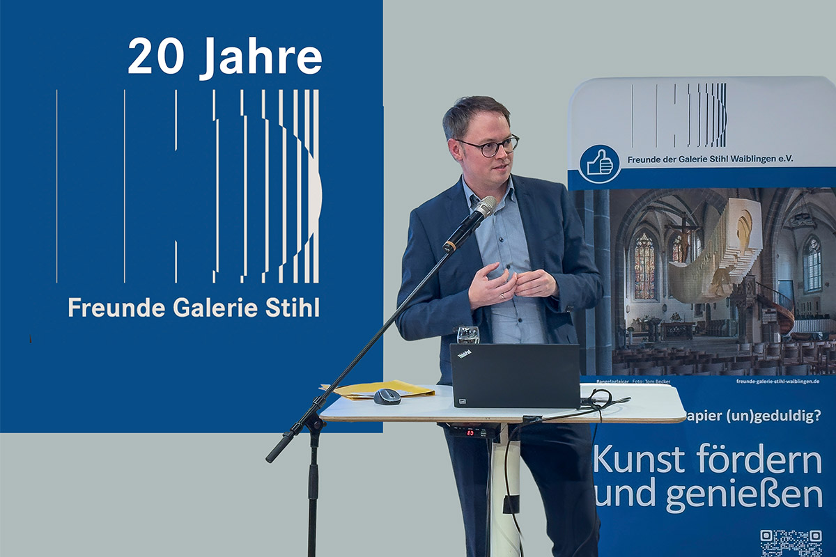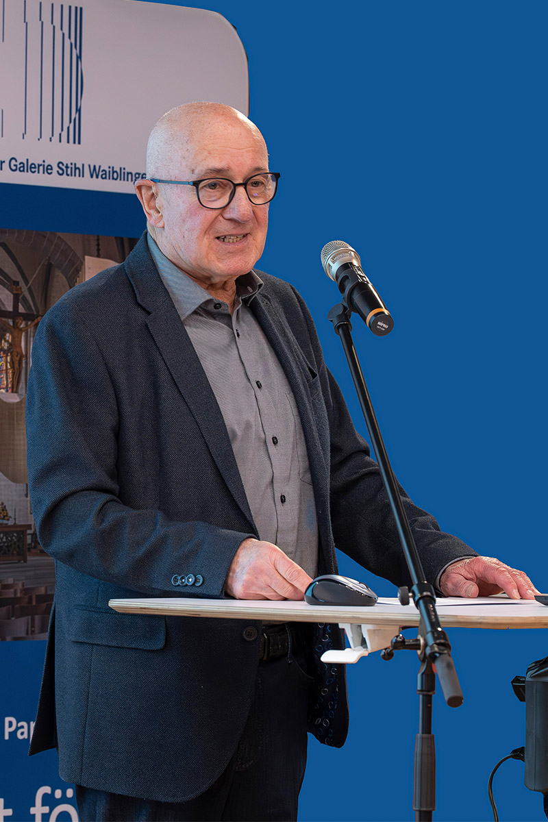 Dr. Hansjörg Thomae wurde in einer Laudatio von seiner Nachfolgerin Juliane Sonntag gewürdigt. Sie sprach dabei von einer Zeitenwende, verlasse mit Hansjörg Thomae doch das letzte echte Gründungsmitglied den Kreis des Vorstands. Inhaltlich indes, werde es keine Wende geben: die Freunde der Galerie Stihl Waiblingen würden den Entwicklungen der Zeit trotzen und weiter auf Kunst und Kommunikation setzen und die Kultur in Waiblingen, konkret die Galerie Stihl, fördern. Und das gerade in Zeiten, in denen vielerorts die Unterstützung für die Kultur wegbreche.